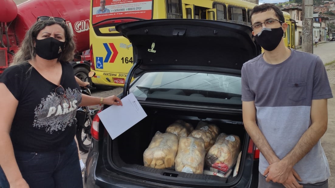 #pratodosverem: Imagem mostra representante da Sociedade São Vicente de Paulo ao lado do professor Carlos Artur Leal, do IF Sudeste MG, em entrega de cestas. Ao fundo, aparece um veículo com porta-malas aberto, que comporta algumas cestas doadas pelo projeto Educação e Cidadania. Eles estão de máscara e próximos à fachada do Campus Santos Dumont.