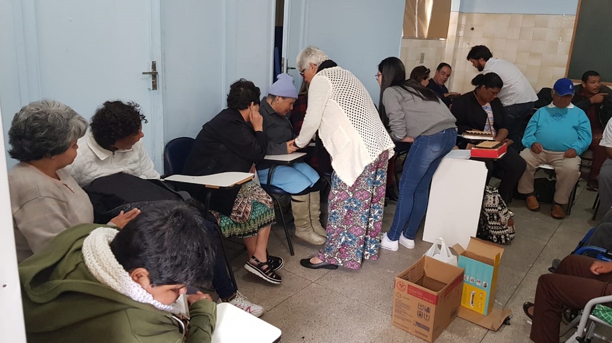 #pratodosverem: A imagem mostra integrantes da equipe do projeto interagindo com pessoas atendidas pela Associação dos Cegos em Juiz de Fora, que estão sentadas. Algumas pessoas manipulam maquetes de elementos associados à ferrovia. Foto: Samuel Alves (arquivo pessoal), publicada com autorização da Associação dos Cegos em Juiz de Fora.