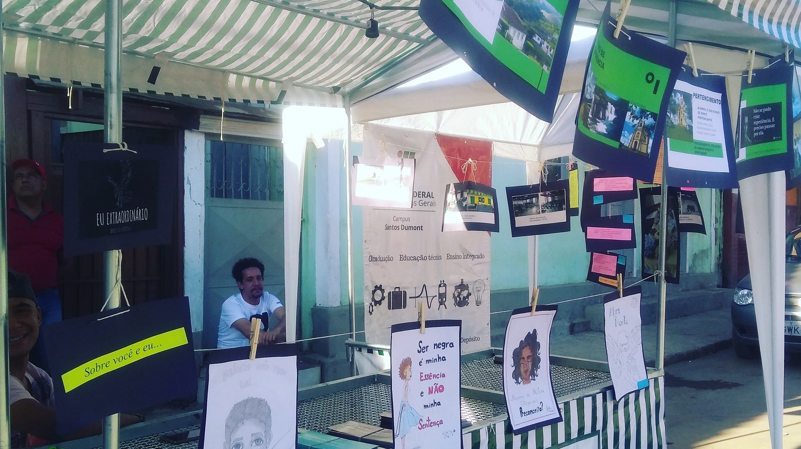#pratodosverem: Imagem mostra estande com varal que exibe fotos e relatos do projeto "Destino Formoso" acima e desenhos do projeto "Eu Extraordinário" abaixo. Foto: Iara Nascimento.