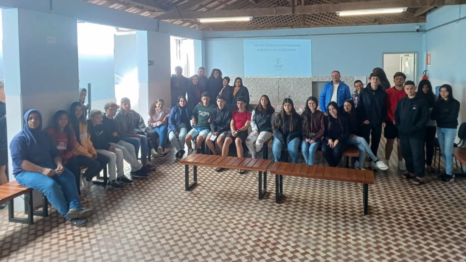 #pratodosverem: Imagem mostra participantes da palestra sobre Lei de Cotas, realizada na Escola Estadual Rubem Esteves Ruffo, em Oliveira Fortes