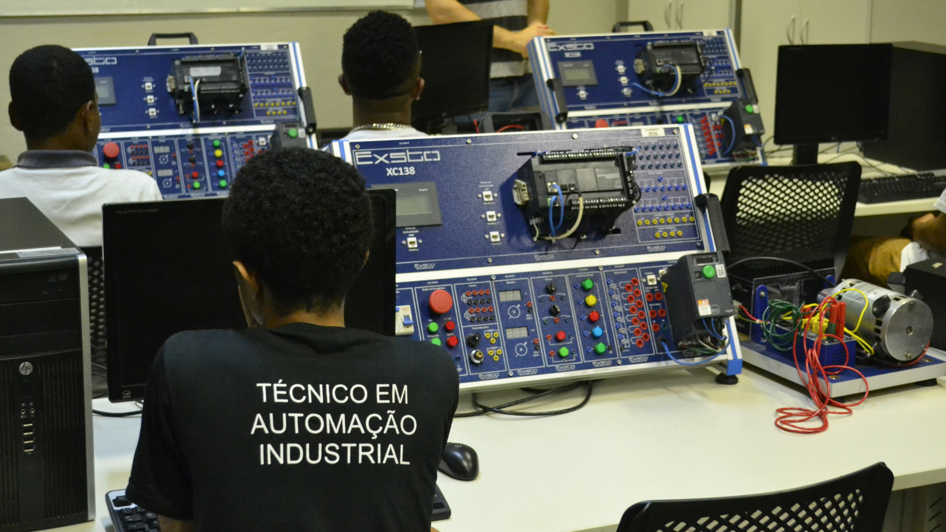 #pratodosverem: Imagem mostra estudantes de Automação Industrial em laboratório do Campus Santos Dumonr