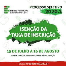 Os candidatos que ainda não fizeram o pedido de taxa de isenção para o Processo Seletivo 2020.1 do Instituto Federal Sudeste de Minas Gerais tem até o dia 16 de agosto para garantir a gratuidade nas inscrições que se iniciam em setembro. O aluno interessado poderá acessar o edital com as informações no link: https://copese.ifsudestemg.edu.br