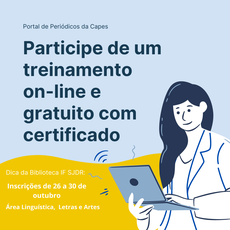 Atenção, no período de 26/10/2020 a 30/10/2020 estão disponíveis os treinamentos na área de Linguística, Letras e Artes.  Acesse http://www.periodicos.capes.gov.br/ e não deixe de se inscrever.