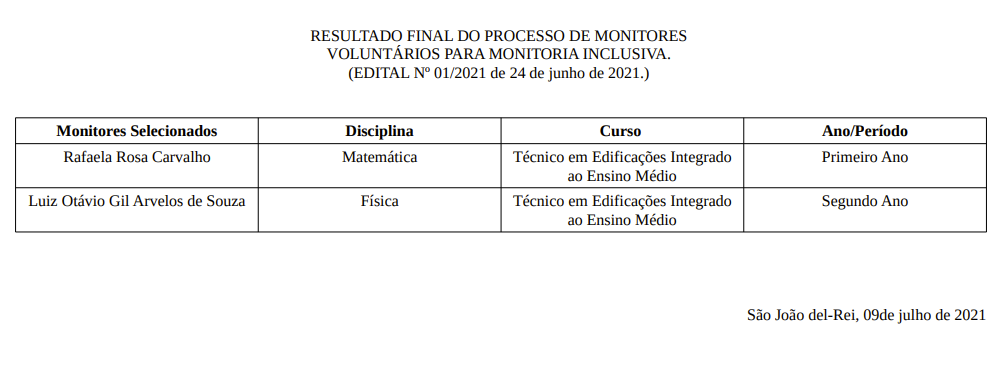 O IF Sudeste MG - Campus São João del-Rei publica o resultado final da seleção de monitores voluntários para monitoria inclusiva, edital Nº 01/2021 de 24 de junho de 2021.