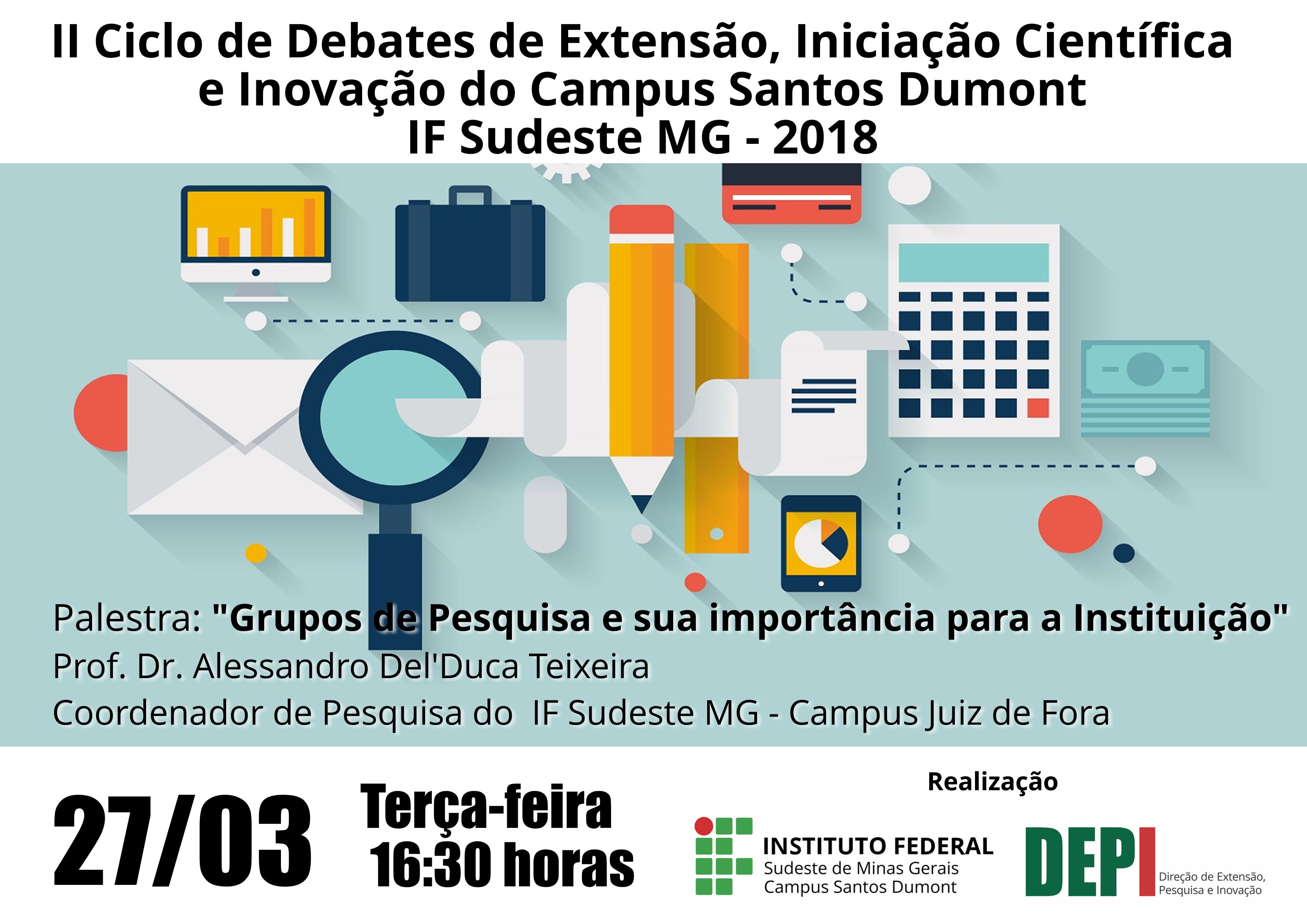 Desde 2017 a DEPPI do Campus Santos Dumont organiza no primeiro semestre do ano um Ciclo de Debates de Extensão, Iniciação Científica e Inovação que conta com palestras, oficinas e debates sobre soluções, práticas e experiências junto aos nossos professores e técnicos administrativos.